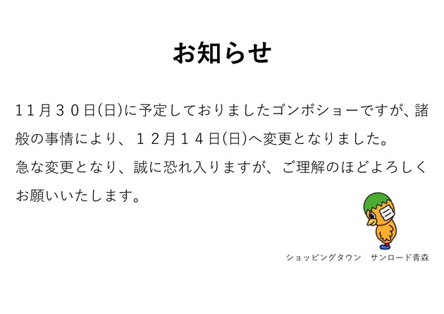 「11月30日(日)ゴンボショー変更のお知らせ」