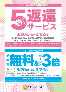 「5%返還3DAY・サンロードSカード手数料無料&ポイント3倍」3月20日(金・祝)~3月22日(日)開催!