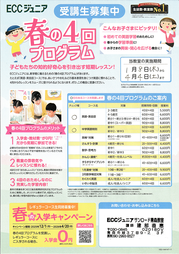 ECCジュニア「春の4回プログラム 受講生募集中」2025.12.25更新
